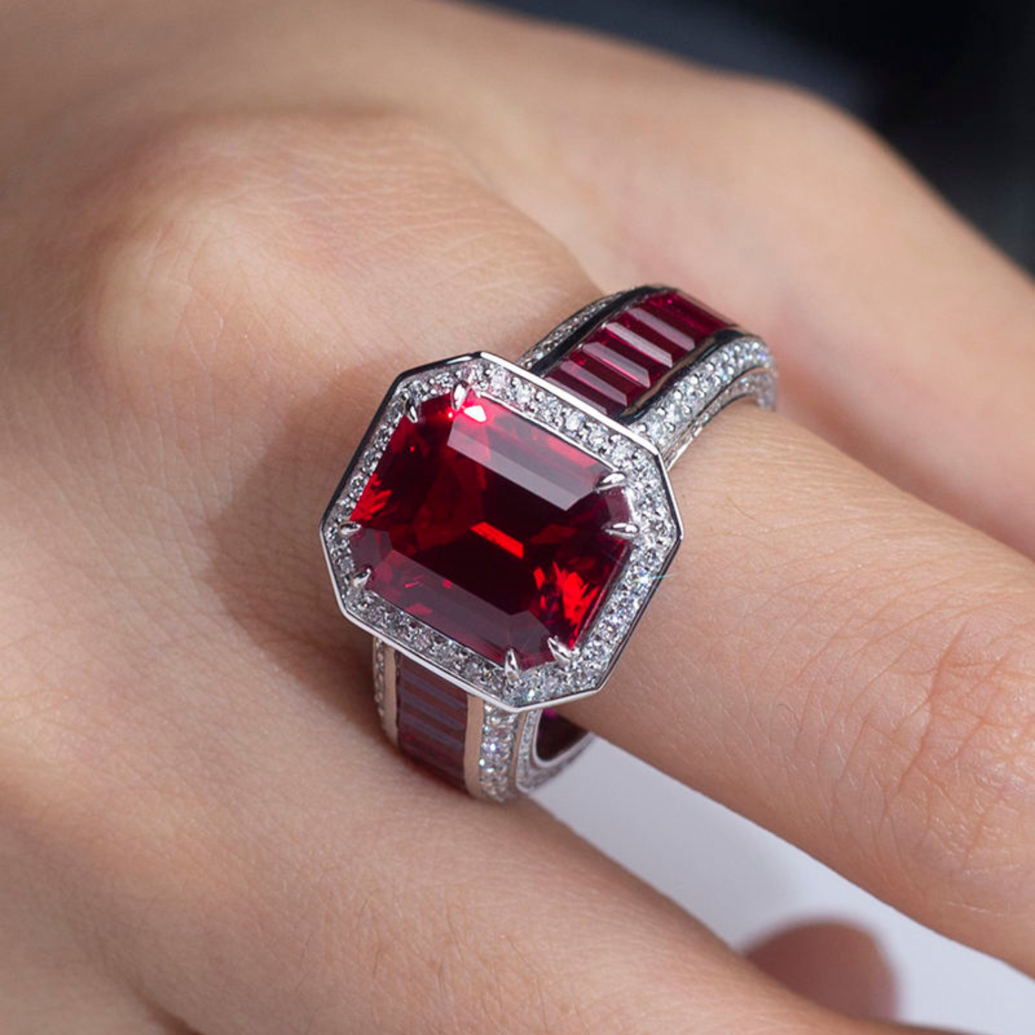 奢華實驗室培育紅寶石切割戒指以一顆實驗室製造的紅寶石鑲嵌在拋光的戒指帶上,其精確的切割最大化了閃耀度。它優雅的設計和鮮豔的紅色調使其成為時尚造型的經典之作。